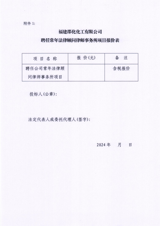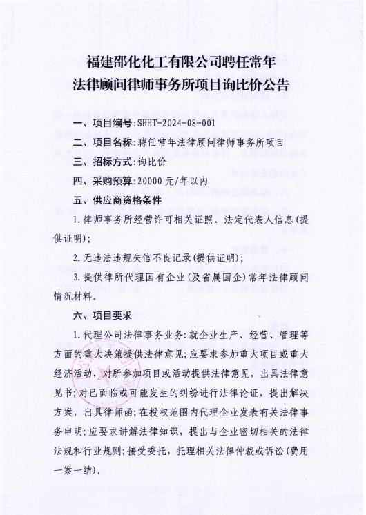 福建邵化化工有限公司聘任常年法律顧問(wèn)律師事務(wù)所項(xiàng)目詢比價(jià)公告